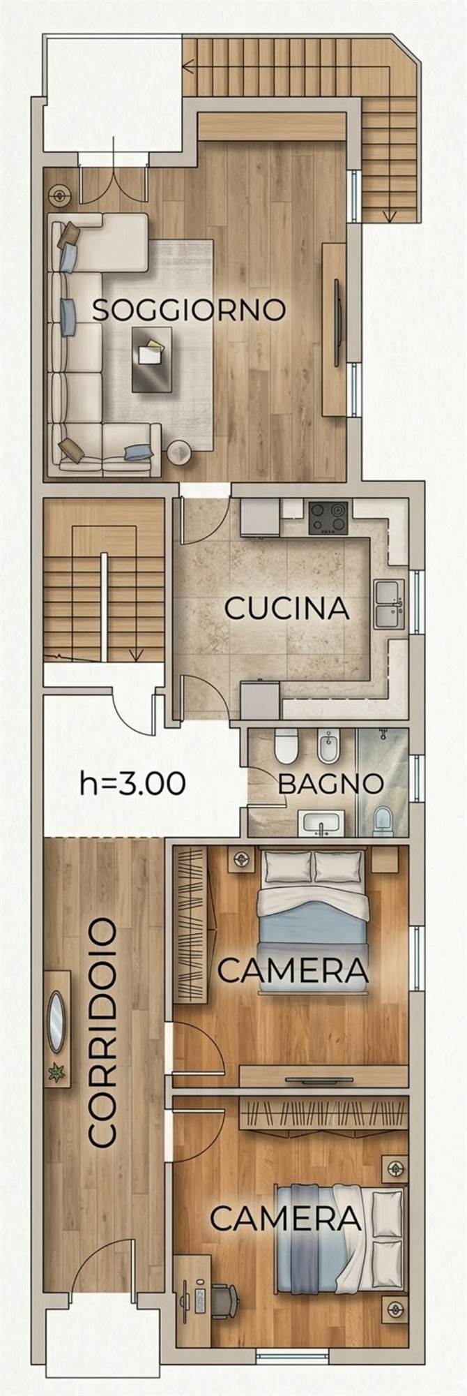 Appartamento Piano Superiore: Caratterizzato da volumi ampi e luminosi, con una distribuzione degli spazi che permette di ricavare una zona giorno con cucina separata, 2 camere da letto matrimoniali, un bagno ed un romantico balconcino.