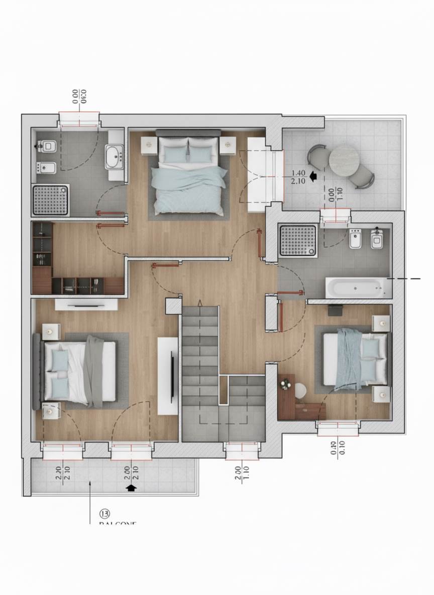 o	Piano Primo: Suite padronale da sogno (25 mq) con bagno privato e cabina armadio, una spaziosa camera matrimoniale (18 mq) e un'ampia camera singola (10 mq). Doppi servizi al piano, oltre a balcone (4 mq) e terrazzo (8 mq).