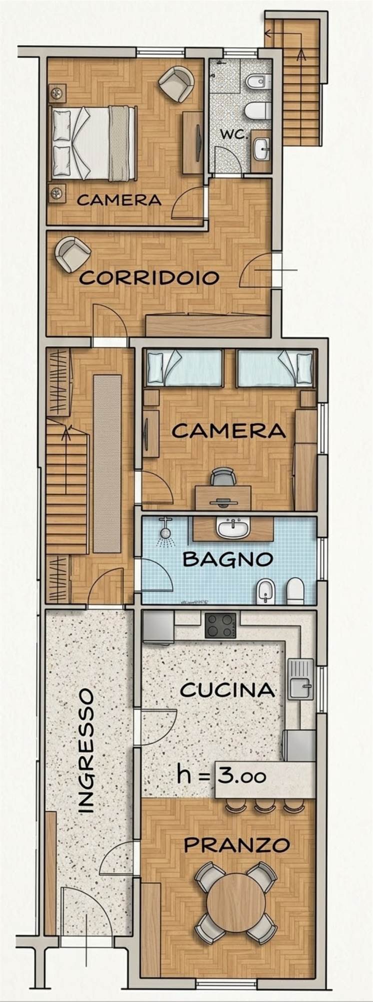 Appartamento Piano Superiore: Caratterizzato da volumi ampi e luminosi, con una distribuzione degli spazi che permette di ricavare una zona giorno con cucina separata, 2 camere da letto matrimoniali, un bagno ed un romantico balconcino.